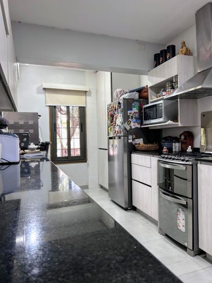 🔹 Cocina revestida con porcelanato, alacenas, mesada de granito negro Brasil .